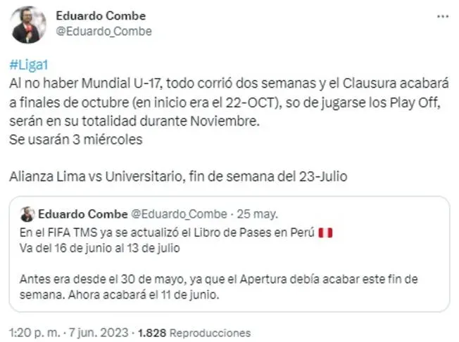Eduardo Combe responde la pregunta de este artículo: “Tras no haber Mundial U-17, todo corrió dos semanas y el Clausura acabará a finales de octubre (en inicio era el 22-OCT), de jugarse los Play Off, serán en su totalidad durante Noviembre. Se usarán 3 miércoles. Alianza Lima vs Universitario, fin de semana del 23-Julio”.