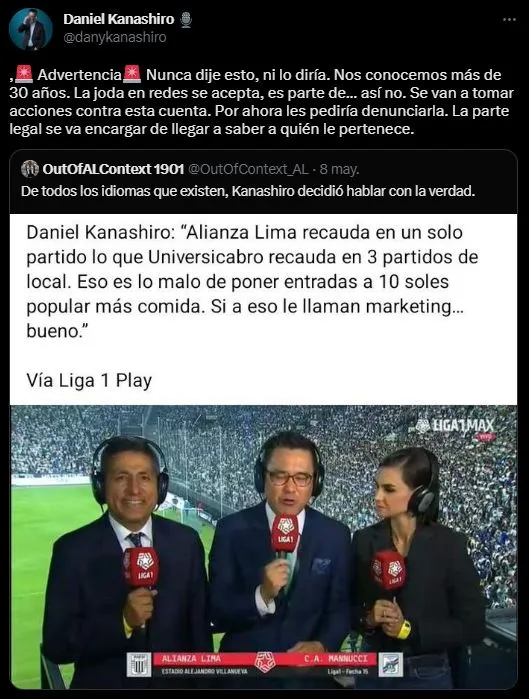 Lo que mencionó Kanashiro es sencillo: “Nunca dije esto ni lo diría. Nos conocemos más de 30 años. La joda en redes se acepta, es parte de (…) así, no. Se van a tomar acciones contra esta cuenta. Por ahora, les pediría denunciarla. La parte legal se va a encargar de llegar a saber a quién le pertenece”.