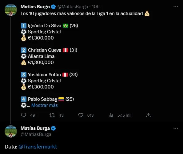 En su cuenta de Twitter, Matías Burga, dio el listado según la base estadística de Transfermarkt. Una fuente confiable donde se ve el valor actualizado por partido completado, de cada jugador que está en el campeonato local. Veremos este listado para entender quién hoy por hoy es el más relevante de todos.