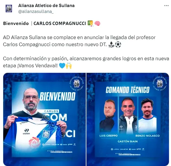 “La Asociación Deportiva Alianza Sullana se complace en anunciar la llegada del profesor Carlos Compagnucci como nuestro nuevo director técnico”, se puede leer en la publicación de los Churres.