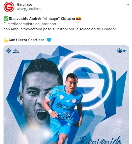 “¡Bienvenido Andrés El Mago Chicaiza! El mediocampista ecuatoriano con amplia trayectoria pasó su fútbol por la selección de Ecuador”, escribieron los cusqueños en sus redes sociales.
