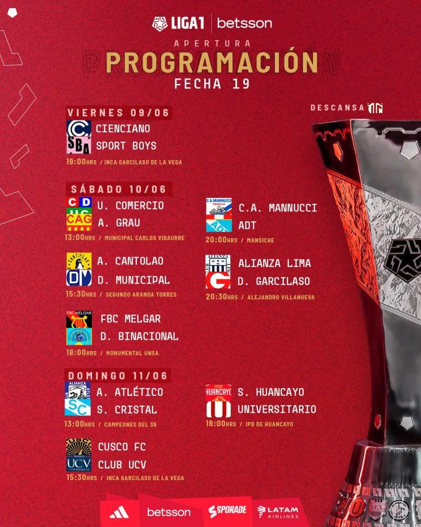 Resolviéndose que Alianza Lima ganó el Torneo Apertura de la Liga 1, todavía quedan dos fechas por jugarse, en ese sentido, ya está listo el calendario de la 19.