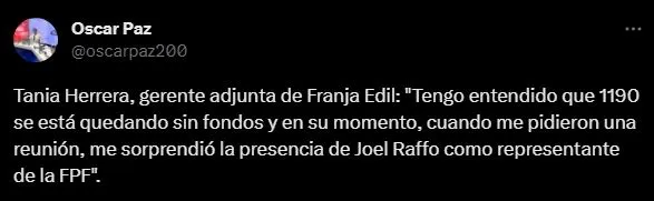 En conversación con Radio Exitosa, apuntó el conductor, Oscar Paz, lo siguiente: “Tania Herrera, gerente adjunta de Franja Edil: “Tengo entendido que 1190 se está quedando sin fondos y en su momento, cuando me pidieron una reunión, me sorprendió la presencia de Joel Raffo como representante de la FPF””.