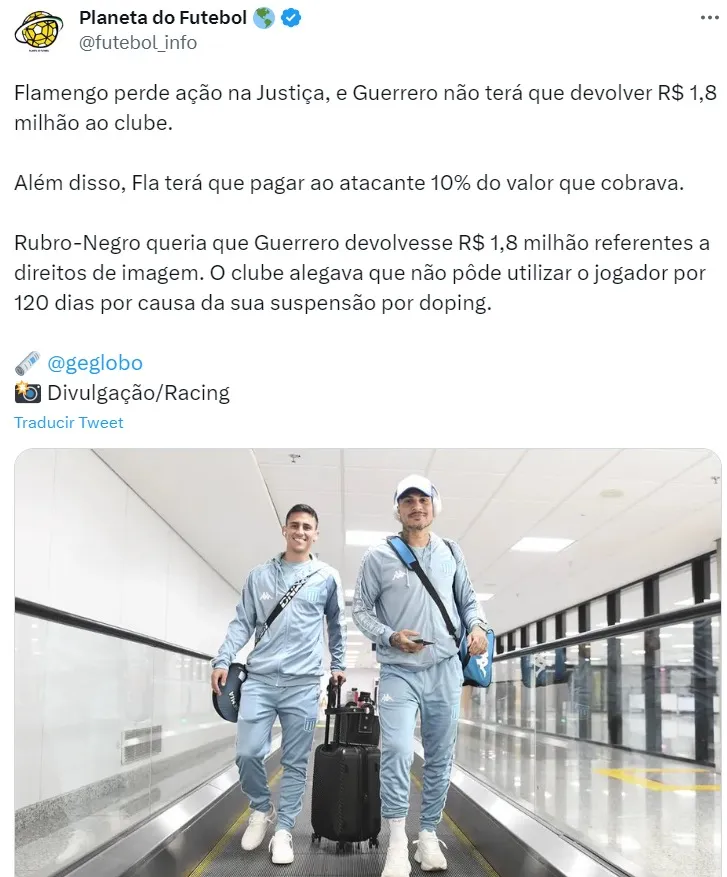No sucediendo, los dos implicados fueron a juicio y hace unas horas un tribunal tomó una decisión: Guerrero no tendrá que pagarle a Flamengo