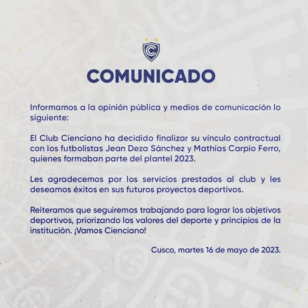 Como otras tantas veces ha sucedido, la situación deportiva de Jean Deza se comunicó mediante una nota de prensa en redes sociales. Firmándola ahora Cienciano, el presente no cambia.