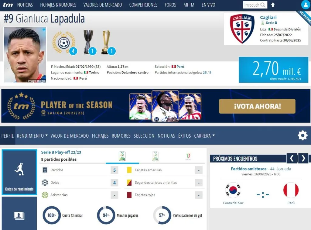 Si bien Gianluca Lapadula tiene contrato con Cagliari hasta junio del 2025, a sus 33 años el delantero está en todo su apogeo futbolístico.