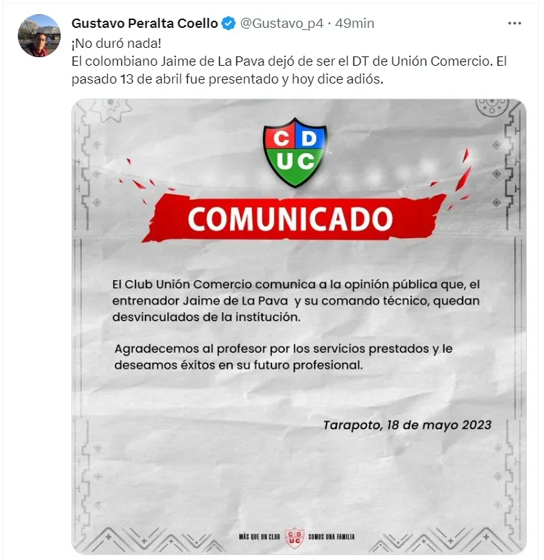 Llegando la noticia vía redes sociales, el periodista Gustavo Peralta publicó la imagen con la información. Tratándose de un comunicado de prensa, el club Unión Comercio fue el protagonista.