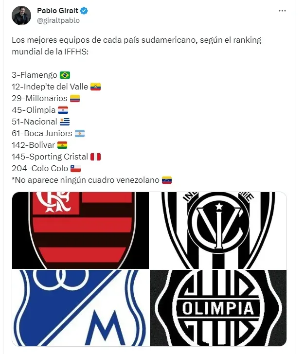 Puestos más abajo está Olimpia 45, Nacional 51 y Boca Juniors 61. Llegando de ahí el lote de los más relegados, Bolivar en el 142, Sporting Cristal en el 145, Colo Colo en el 204 y ningún equipo venezolano aparece.