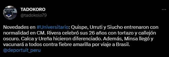En ese sentido, el elenco dirigido por Jorge Fossati entrenó en Campo Mar donde, Piero Quispe, Luis Urruti y Roberto Siucho trabajaron con normalidad, por lo que podrían ser considerados por el estratega para la siguiente jornada del torneo Apertura.