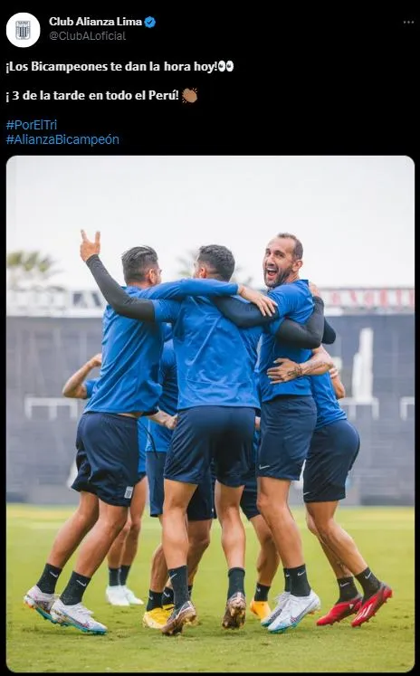 “¡𝗟𝗼𝘀 𝗕𝗶𝗰𝗮𝗺𝗽𝗲𝗼𝗻𝗲𝘀 𝘁𝗲 𝗱𝗮𝗻 𝗹𝗮 𝗵𝗼𝗿𝗮 𝗵𝗼𝘆! ¡ 𝟯 𝗱𝗲 𝗹𝗮 𝘁𝗮𝗿𝗱𝗲 𝗲𝗻 𝘁𝗼𝗱𝗼 𝗲𝗹 𝗣𝗲𝗿𝘂́!”, se puede notar en esta celebración. Donde están los jugadores más representativos de Alianza Lima en un abrazo, como si se hubiesen enterado de una gran noticia. Momento lleno de folclore, ojalá no pase nada extraño.