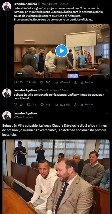 El periodista Tato Aguilera contó cómo fue el transcurso de la sesión de hoy para el extremo: “Sebastián Villa ingresó al juzgado correccional nro. 2 de Lomas de Zamora. En minutos, la jueza Claudia Dávalos dará la sentencia por la causa de violencia de género que tiene el futbolista. Si es culpable, Boca deja de convocarlo en partidos oficiales”.