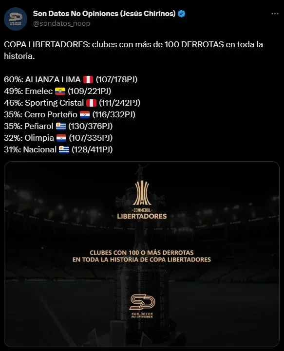 Lamentablemente, el peor equipo en Copa Libertadores en peruano: “COPA LIBERTADORES: clubes con más de 100 DERROTAS en toda la historia. 60%: ALIANZA LIMA (107/178PJ). 49%: Emelec (109/221PJ). 46%: Sporting Cristal (111/242PJ). 35%: Cerro Porteño (116/332PJ). 35%: Peñarol (130/376PJ). 32%: Olimpia (107/335PJ). 31%: Nacional (128/411PJ).