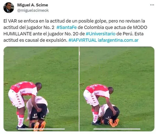 “El VAR se enfoca en la actitud de un posible golpe, pero no revisan la actitud de Marlon Torres que actúa de modo humillante ante Álex Valera de Universitario de Perú. Esta actitud es causal de expulsión”, indicó Miguel Scime.
