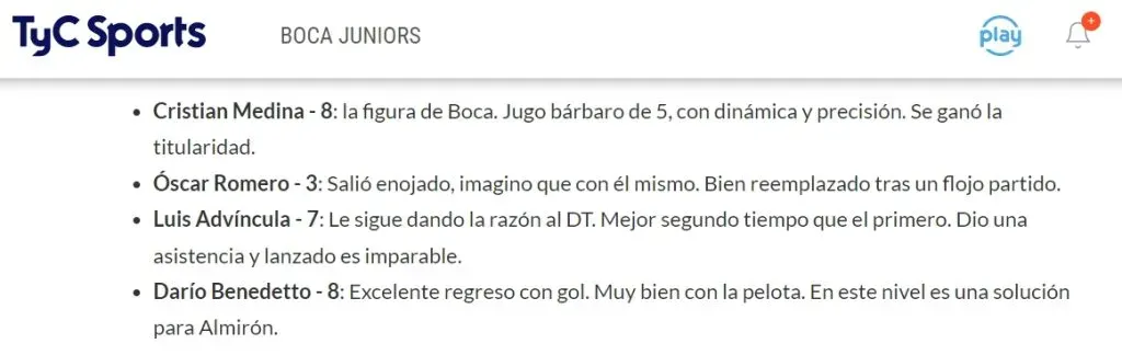 Recibiendo los elogios de Olé y TyC Sports, el peruano recibió puntuaciones por encima del promedio. Calificado con 7.25, el peruano recibió las palmas.