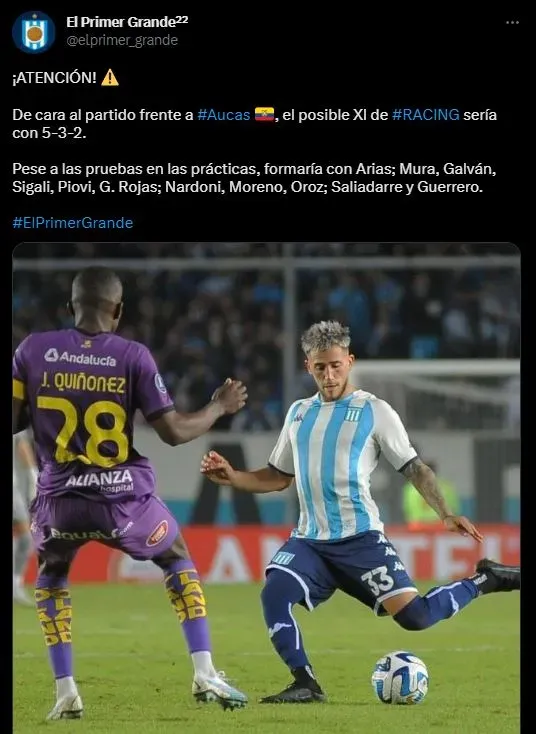 El once que estará lanzando Racing Club frente Aucas de Ecuador sería el siguiente: Arias; Mura, Galván, Sigali, Piovi, G. Rojas; Nardoni, Moreno, Oroz; Saliadarre y Paolo Guerrero. Ahí vemos el nombre del peruano, todo esto según la información del medio partidario, El Primer Grande. La mejor noticia para el goleador y capitán de la Selección Peruana.