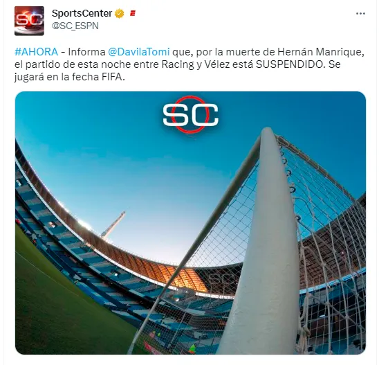 “Informa Tomas Davila que, por la muerte de Hernán Manrique, el partido de esta noche entre Racing y Vélez está SUSPENDIDO. Se jugará en fecha FIFA”, publicaron.