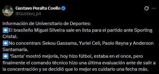 Por un lado tenemos a Anderson Santamaría, en este caso no es llamado por un tema de lesión. Si bien entrenó con el equipo, no quieren arriesgarlo, saben que es alguien importante, así que lo mantienen fuera de la convocatoria. Por su parte, Paolo Reyna tampoco es tomado en cuenta. Otro futbolista que venía siendo recurrente en el cuadro ‘crema’ y que esta vez lo verá en la TV.