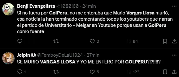 Se estaba disputando el partido entre Universitario de Deportes y Melgar por la fecha número ocho del Torneo Apertura, cuando una triste noticia cayó como baldazo de agua fría a todos. Pues se daba a conocer que Mario Vargas Llosa había perdido la vida, un hecho que nadie esperaba y que agarró por sorpresa a los conductores, así como a los mismos oyentes.