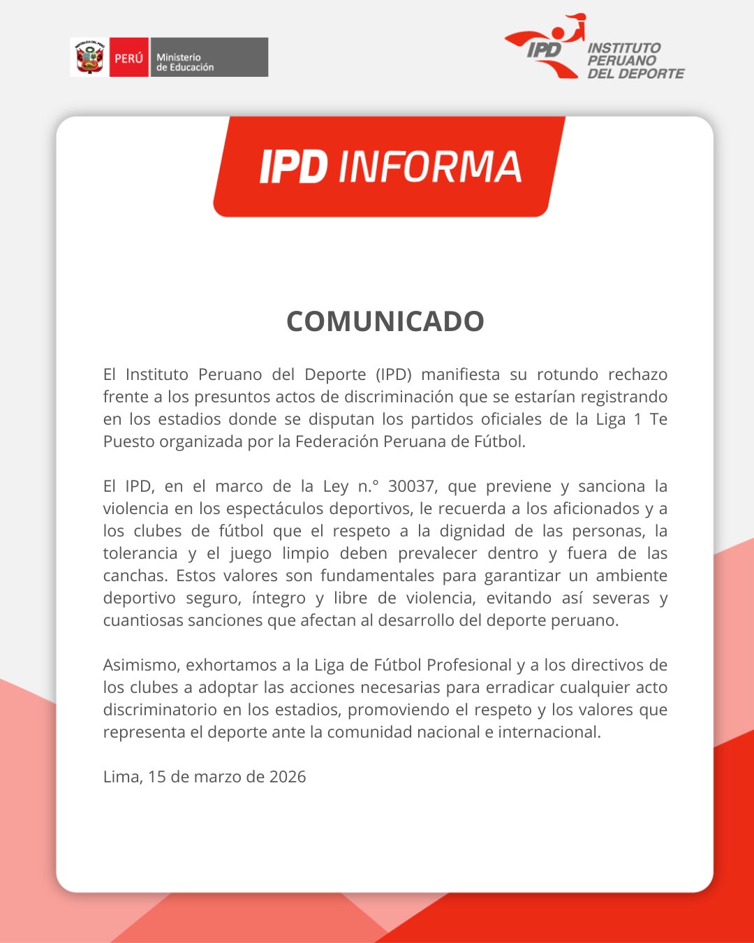 Por su parte, el Instituto Peruano del Deporte (IPD) recordó la vigencia de la Ley n.° 30037, la cual sanciona la violencia en espectáculos deportivos. La institución exhortó a los directivos de los clubes a tomar medidas urgentes para erradicar estas conductas de los recintos nacionales.