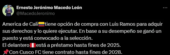 “América de Cali tiene opción de compra con Luis Ramos para adquir sus derechos y lo quiere ejecutar. En base a su desempeño se ganó un puesto y está convocado a la selección“, fue lo que pudo dar a conocer el periodista Ernesto Jerónimo Macedo León en sus redes sociales.
