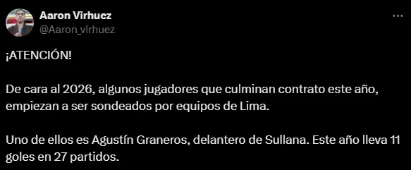 Según lo que se ha podido conocer por el periodista Aaron Virhuez, el atacante viene siendo seguido por clubes de la capital. “De cara al 2026, algunos jugadores que culminan contrato este año, empiezan a ser sondeados por equipos de Lima. Uno de ellos es Agustín Graneros, delantero de Sullana. Este año lleva 11 goles en 27 partidos“, fue lo que publicó en sus redes sociales.