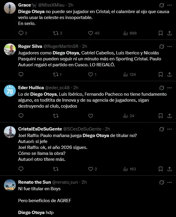 Entre los jugadores que han sido más cuestionados tenemos a Diego Otoya, quien en este juego le dieron la gran responsabilidad de ser titular. Una decisión que terminó pesando mucho, pues no llegó a ser un jugador útil en la cancha, siendo tratado por muchos hinchas como un elemento menos dentro del campo para los ‘celestes’.