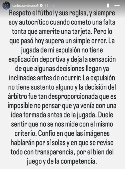 Tras esta situación, el defensor nacional decidió hacer su descargo en las redes sociales. Pues considera que esta acción es injusta, ya que no considera que fuera merecida la segunda amarilla. La cual provocó que tenga que irse antes de tiempo a los vestuarios en el primer tiempo.
