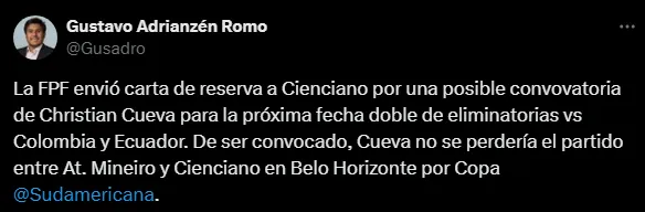 Se conoció mediante el periodista Gustavo Adrianzén que Christian Cueva estaría en la prelista de la Selección Peruana, por eso el cuadro de Cienciano recibió la carta de reserva. Esto deja al jugador con una alta posibilidad de volver a ser tomado en cuenta en una convocatoria de la ‘Bicolor’.