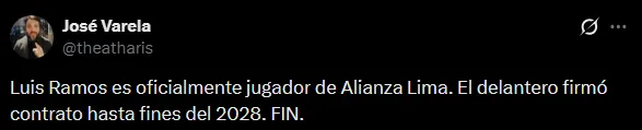 El periodista José Varela mediante sus redes sociales hizo oficial esta contratación: “Luis Ramos es oficialmente jugador de Alianza Lima. El delantero firmó contrato hasta fines del 2028. FIN”, fue lo que publicó en su cuenta personal, dejando en claro que el atacante será el nuevo 9 del cuadro de La Victoria.