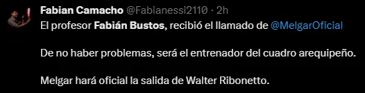 Según lo que se ha podido conocer mediante el periodista Fabián Camacho es de la posible llegada de Fabián Bustos a Arequipa. Se anuncia que hubo un llamado al DT argentino, quien aceptaría tomar las riendas del ‘dominó’ tras la última derrota en casa frente a Cusco FC.