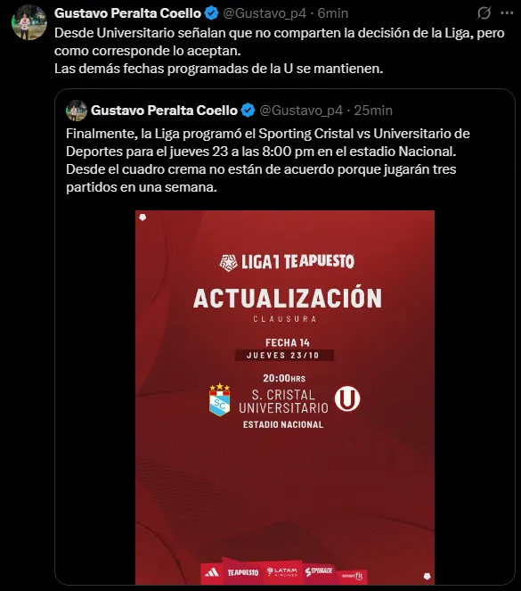 Por otro lado, se conoció mediante el periodista Gustavo Peralta que en Universitario de Deportes no están para nada contentos con la decisión. Esto debido a que justamente en esa semana los ‘cremas’ van a tener que disputar un total de 3 partidos, lo cual les parece injusto.