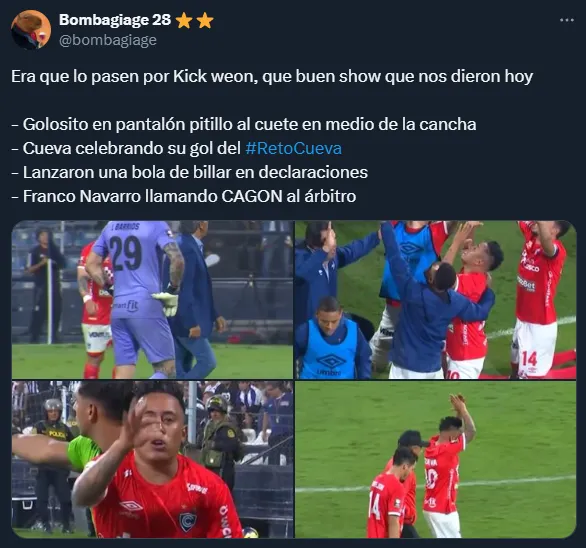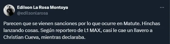 Al salir del campo de juego para irse a vestuarios, Cueva se fue haciendo gestos de disculpas a la hinchada en Matute. Sin embargo, eso no calmó la situación, ya que los aficionados también se la agarraron con el árbitro Bruno Pérez, quien tuvo que irse del campo rodeado de la policía debido a que también le han arrojado objetos buscando agredirlo.