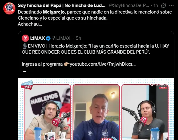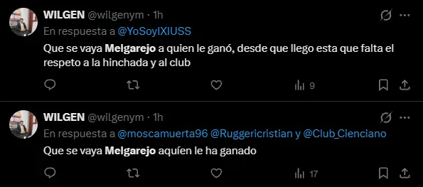 “Que se vaya, ¿a quién le ganó?“, “desatinado“, “desde que llegó que le falta el respeto a la hinchada y al club” tiraron en redes sociales varios hinchas de Cienciano contra el entrenador argentino. Sin dudas, Melgarejo deberá ganarse a los hinchas nuevamente a base de resultados luego de estos cuestionamientos.