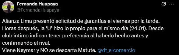 “Alianza Lima presentó solicitud de garantías el viernes por la tarde. Horas después, la ‘U’ hizo lo propio para el mismo día (24.01). Desde club íntimo indican tener preferencia al haberlo hecho antes y confirmando el rival. Viene Neymar y NO se descarta Matute”, se pudo conocer mediante la periodista Fernanda Huapaya.