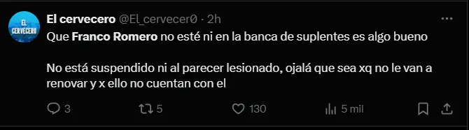 “Que Franco Romero no esté ni en la banca de suplentes es algo bueno. No está suspendido ni al parecer lesionado, ojalá que sea porque no le van a renovar y por ello no cuentan con el”, “Dime qué Romero no está lesionado y que lo sacaron por malo” y “Aquí hay un lectura clara: Romero no seguirá, pero Autuori sabe que Raffo no traerá a nadie por qué está en números rojos, entonces tiene que foguear a los que tiene”; son algunas de las reacciones más llamativas de los hinchas de Sporting Cristal sobre el caso del defensor uruguayo.