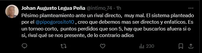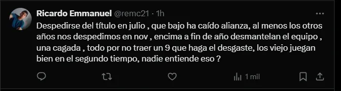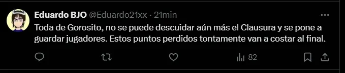 Gorosito. Creo que debemos mas ser directos y enfáticos. Es un torneo corto”, “Despedirse del título en julio, qué bajo ha caído Alianza. Encima a fin de año desmantelan el equipo” y “Toda de Gorosito, no se puede descuidar aún más el Clausura y se pone a guardar jugadores. Estos puntos perdidos tontamente van a costar al final”; son algunas de las reacciones de los hinchas victorianos en ‘X’.
