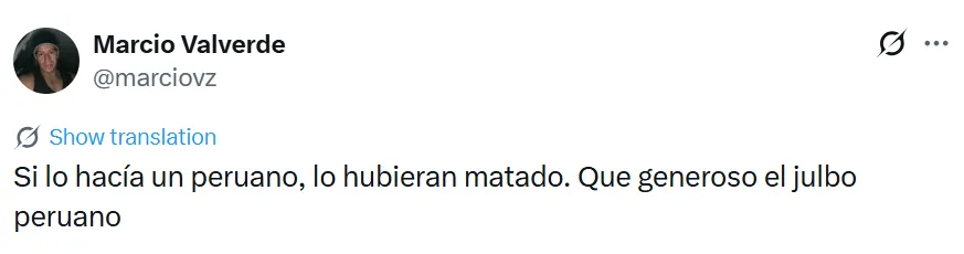 La noticia no tardó en generar reacciones entre exjugadores peruanos. Marcio Valverde, a través de su cuenta de Twitter, expresó su rechazo de manera contundente: “Si lo hacía un peruano, lo hubieran matado. Qué generoso el julbo peruano“.