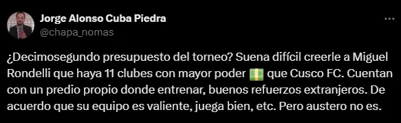 Luego habló de la diferencia económica que tienen los clubes peruanos, poniendo a los cusqueños muy por debajo de varios equipos a nivel de dinero. Pero que a pesar de eso lograron competir, lo cual es un gran mérito para él en este kuego.