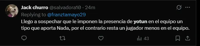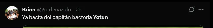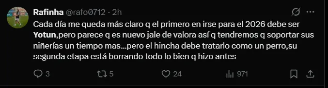 “Ya basta del capitán bacteria Yotún”, “Cada día me queda más claro que el primero en irse para el 2026 debe ser Yotún”, “Yotún ya debe retirarse sinceramente. Se notó que le cuesta jugar a este nivel” y “Llego a sospechar que le imponen la presencia de YotUn en el equipo un tipo que aporta nada, por el contrario resta un jugador menos en el equipo”; son algunos de los comentarios más llamativos de los hinchas de Sporting Cristal hacia el volante.