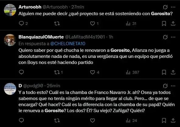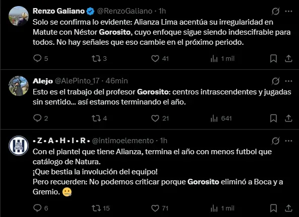 En la red social X (Twitter), hubo muchas críticas para Néstor Gorosito. Los hinchas de Alianza Lima le cuestionan el funcionamiento del equipo, la involución en el rendimiento, en comparación con lo visto por Copa Libertadores y el hecho de no poder ganar como local, lo que lleva a la irregularidad en esta Liga 1.