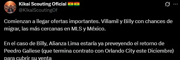 Mediante Kikai Scouting se conoció que el popular ‘Billy’ tendría ofertas de México y Estados Unidos. Su partida básicamente sería por la llegada del ‘Pulpo’, que se vocea termina contrato en el Orlando City y regresaría al Perú para la campaña que se viene.