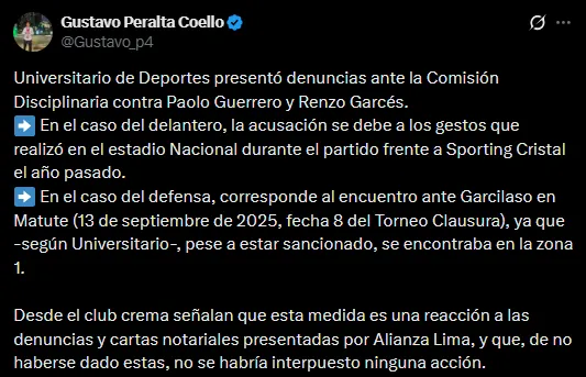 Según lo que ha podido dar a conocer el periodista Gustavo Peralta en sus redes sociales, estas denuncias ya fueron presentadas ante la Comisión Disciplinaria en contra de los jugadores mencionados. En el caso del ‘Depredador’ sería por una acusación por gestos que habría realizado en el estadio Nacional en el partido contra Sporting Cristal.