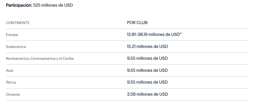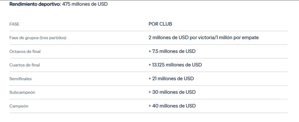 El presupuesto total para los millonarios premios del Mundial de Clubes asciende a 1000 millones de dólares, incluyendo el pilar de rendimiento deportivo de 475 millones de dólares, así como el pilar de participación de 525 millones de dólares, según detalla la FIFA con el siguiente detalle: