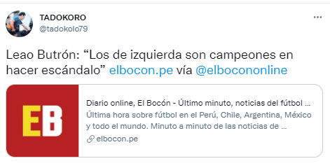 Sobre la polémica que generaron los seleccionados peruanos, al ir contra ‘el comunismo’, Leao Butrón sostuvo: “Excelente lo que hacen los seleccionados. Muchos quieren responsabilizar a la FPF, pero son libres de hacer lo que les guste. Los de izquierda son campeones en hacer escándalos. Ahora que ven que algunos futbolistas de la selección peruana reconocidos han salido a pronunciar su derecho, hacen pataletas. Voten por quien quieran, pero piensen bien. Hay cuatro sentenciados por terrorismo en el Congreso”.