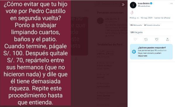 “¿Cómo evitar que tu hijo vote por Pedro Castillo en segunda vuelta? Ponlo a trabajar limpiando cuartos, baños y el patio. Cuando termine, págale S/.100. Después quítale S/.70, repártelo entre sus hermanos (que no hicieron nada), y dile que él tiene demasiada riqueza. Repite este procedimiento hasta que entienda”.
