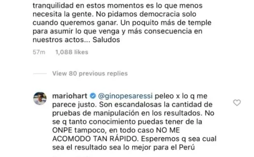 “Mario, con todo cariño, anda averigua cómo es que realmente funciona el conteo de la ONPE. Decir “fraude” o “robo” con tanta tranquilidad en estos momentos es lo que menos necesita la gente. No pidamos democracia solo cuando queremos ganar. Un poquito más de temple para asumir lo que venga y consecuencia en nuestro actos…Saludos”, señaló en un comentario que explotó en likes.
