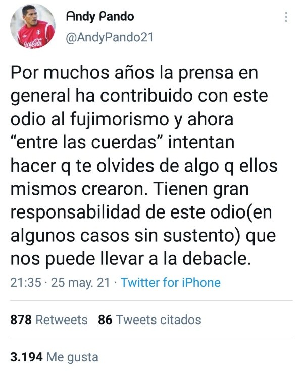 “Por muchos años la prensa en general ha contribuido con este odio al fujimorismo y ahora “entre las cuerdas” intentan hacer que te olvides de algo que ellos mismos crearon. Tienen gran responsabilidad de este odio(en algunos casos sin sustento) que nos puede llevar a la debacle”, escribió.