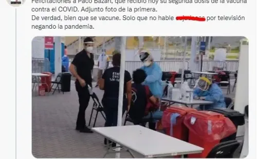 “Felicitaciones a Paco Bazán, que recibió hoy su segunda dosis de la vacuna contra el COVID. Adjunto foto de la primera. De verdad, bien que se vacune. Solo que no hable coj…por televisión negando la pandemia”, indicó el tuitero.
