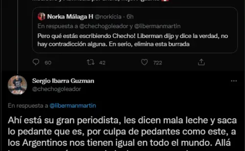 Esto rápidamente le llegó al goleador histórico del fútbol peruano, quien atinó a decir lo siguiente: “Ahí está su gran periodista, les dicen mala leche y saca lo pedante que es, por culpa de pedantes como este, a los argentinos nos tienen igual en todo el mundo. Allá lo conocen más por mala leche que por un buen periodista, que siga metido en su Twitter, lo único que le queda”. Veremos si se da la respuesta del ahora comunicador de ESPN, según información local.