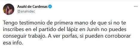Anahí de Cárdenas, por ejemplo, a pesar de hacer campaña en contra de Keiko en primera vuelta, puso en duda algunos de los principios del cajamarquino: “Tengo testimonio de primera mano de que si no te inscribes en el partido del lápiz en Junín no puedes conseguir trabajo. A ver porfas, si pueden corroborar esa info”.